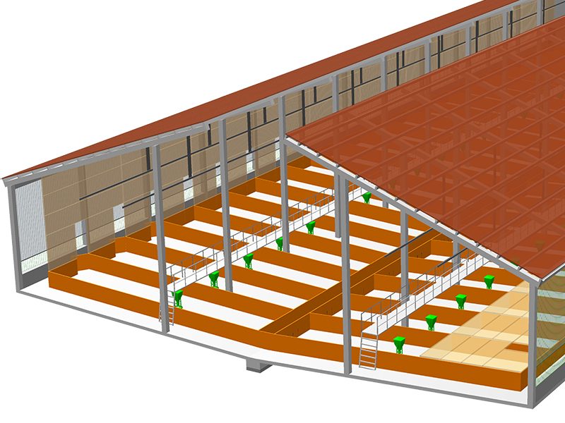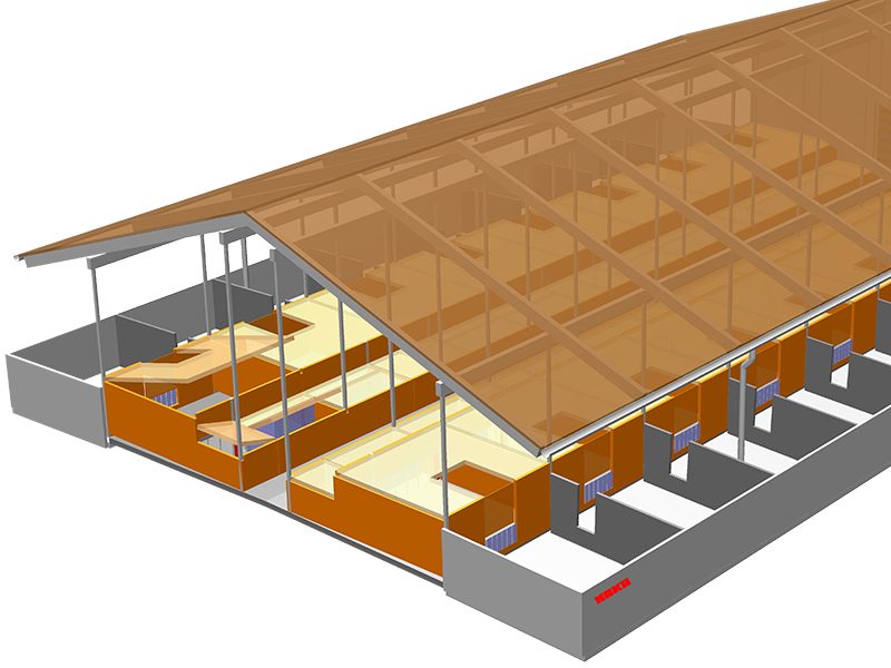 Diese 3-Flächen-Bucht ist analog zu den Wartebereichen aufgebaut und kann als preisgünstigste Variante identisch gebaut werden. Für Interessenten die nicht im „Kaltbereich“ besamen wollen gibt es die Möglichkeit das Dach so zu gestalten, dass über einen isolierten „Dachschieber“ der Gesamtraum geschlossen und damit auch geheizt werden kann.