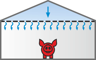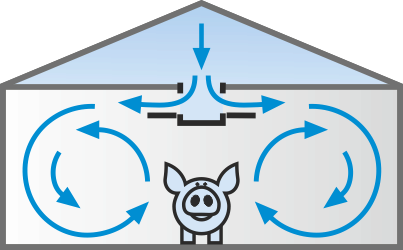 Bedingt durch den Coanda-Effekt gleitet die Frischluft an der Stalldecke entlang. Hierdurch bilden sich impulsreiche Luftströmungen im Raum aus.