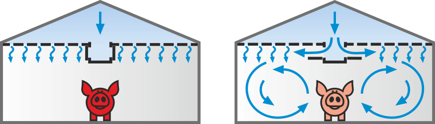 Impulsarme Zuluft im Winterbetrieb für ein gutes Wärmepolster am Tier und die impulsreiche Zuluft im Sommerbetrieb zur Verstärkung des Wärmeabtransports.